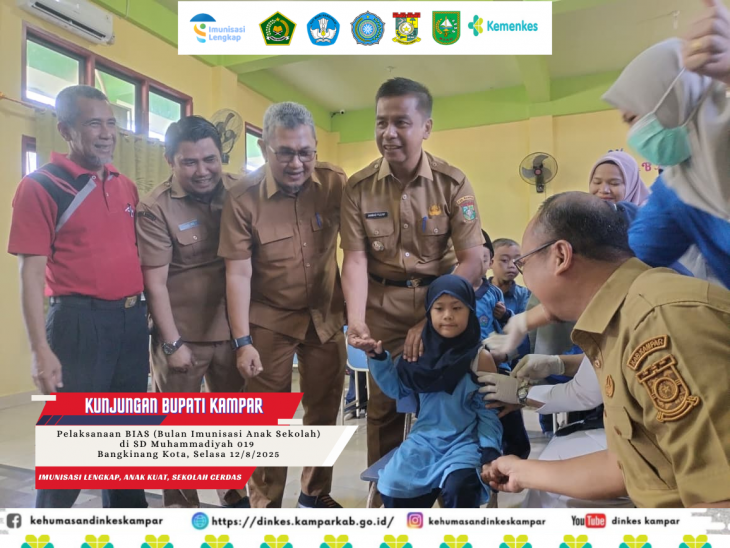 Bangkinang Kota. Bupati Kampar, Ahmad Yuzar yang didampingi Kadiskes Kampar dr. Asmara Fitrah Abadi melakukan kunjungan ke Sekolah SDM 019 Bangkinang Kota pada Selasa, 12 Agustus 2025, untuk memantau pelaksanaan Bulan Imunisasi Anak Sekolah (BIAS). Kunjungan ini didampingi oleh Kabid Pencegahan dan Pengendalian Penyakit, Haryanto, SKM, MKM dan Kepala Puskesmas Bangkinang Kota.